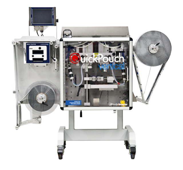 The QuickPouch Vertical is a compact, economical, customizable pouch form/fill/seal machine designed to fit almost any need. It is a cycle-on-demand system that uses a hot die to form pouches from rollstock, leaving the top of the pouch open for loading, and then sealing the pouch during the next cycle.